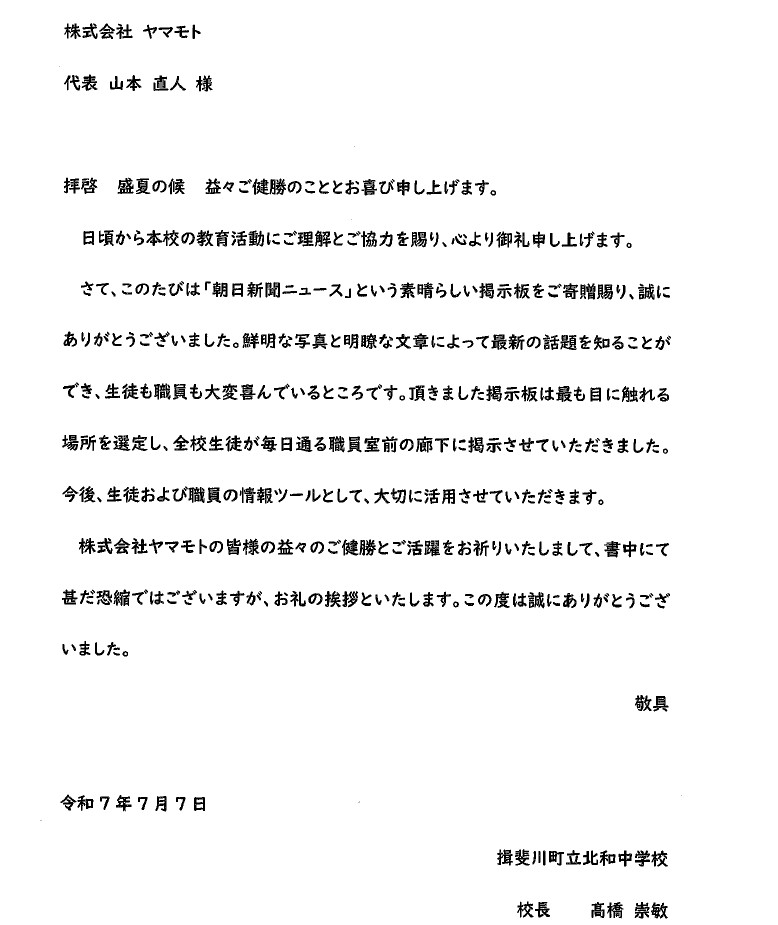寄付「朝日写真ニュース」▶北和中学校 2025/07/15 北和中学校へ「朝日新聞ニュース」の掲示板をSDGsの取組の一環として、寄付しました。 子どもたちの学の一環として、活用していただければ幸いです。 校長先生より、お手紙もいただきました。